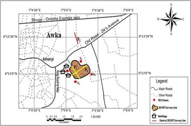 The dumpsite used in this study is located at the industrial layout of Awka-North where there is also a new residential layout sited. The study site is located at about 500 m off Ring Road junction Awka, Anambra State Nigeria. The area is bounded by latitudes 6°13′35′′N and 6°13′52′′N and longitudes 7°5′15′′E and 7°5′16′′E at the elevation of about 180 m above mean sea level. Figure 1 shows the base map of the survey site showing the VES points (𝑉1, 𝑉2, 𝑉3 and 𝑉4) and profile lines (𝑃𝑐, 𝑃1 and 𝑃2 ). Two main climatic seasons characterize the study area; the rainy season which is associated with the moist maritime southwesterly trade wind from the Atlantic Ocean and the dry season which is associated with the Atlantic Continental northwesterly wind from the Sahara Desert. The average time window for rainy season and dry season are April to October and November to March respectively. Between the two seasons is the occurrence of short-lived cold-dry season which is characterized by low temperature, hazy and dusty atmosphere southeasterly from Sahara Desert.